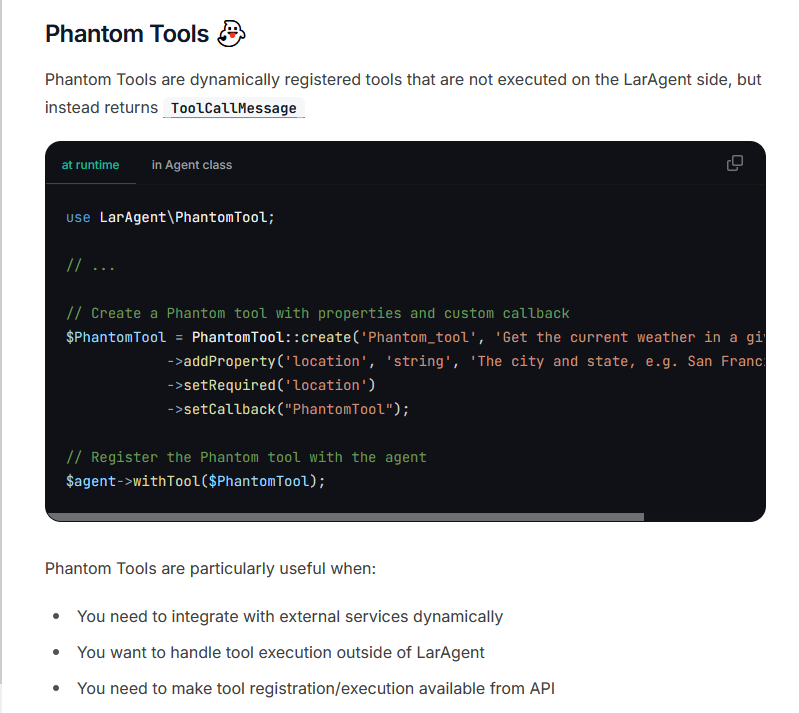 The new PhantomTool feature allows you to define and return tools dynamically from API requests β skipping the LarAgent side execution.
